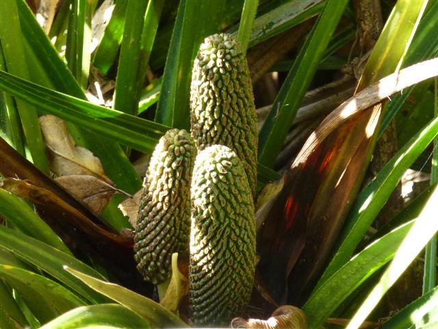 One kiekie patch on the Kokekohe Track has had 15 flowers. Kiekie (Freycinetia banksii) is a many-branched woody vine with tufts of long leaves, highly-valued by Maori for weaving. The spectacular flowers appear at the ends of the tufts. Fruits form later and are prized rat and possum-food, so our fruiting kiekie show pest levels are declining.