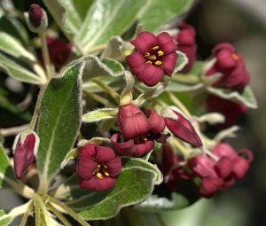 On the left of the entry point is a large karo (Pittosporum crassifolium), which has greyish, leathery leaves and small dark red flowers in spring.