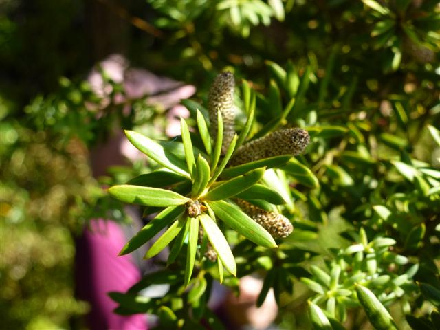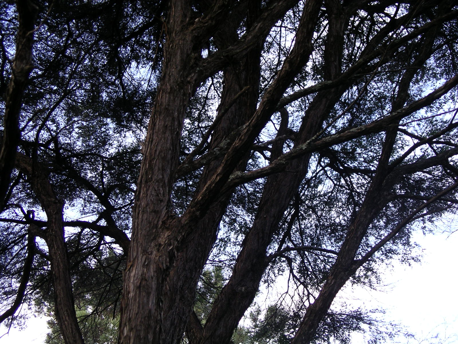 A planted totara – note its spiralling, stringy bark. Totara leaves are prickly.