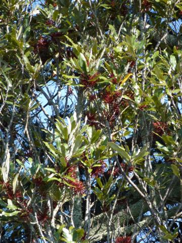 A large, planted rewarewa (Knightia excelsa) – New Zealand honeysuckle – with a 1940s totara alongside. Rewarewa has long serrated leaves, red flowers in spring followed by woody follicles. Rewarewa flowers produce abundant nectar – important for tui and for the honey industry.