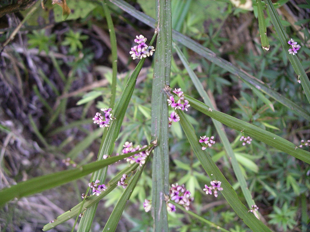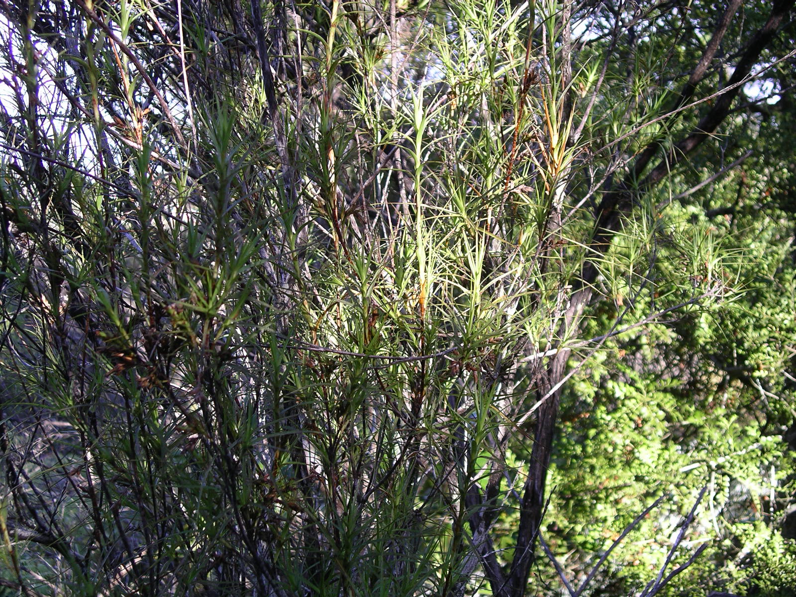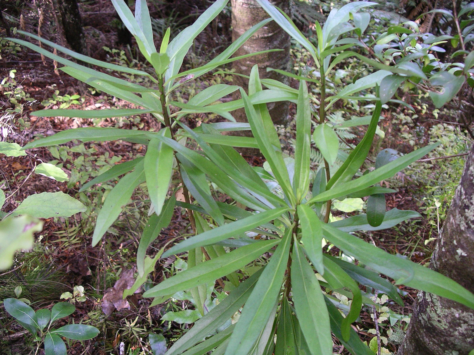 Hebe(Veronica macrocarpa var. macrocarpa), is an edge plant, characteristic of gumland scrub. Note its long, narrow leaves. In late winter it has white flowers, tinged with mauve.