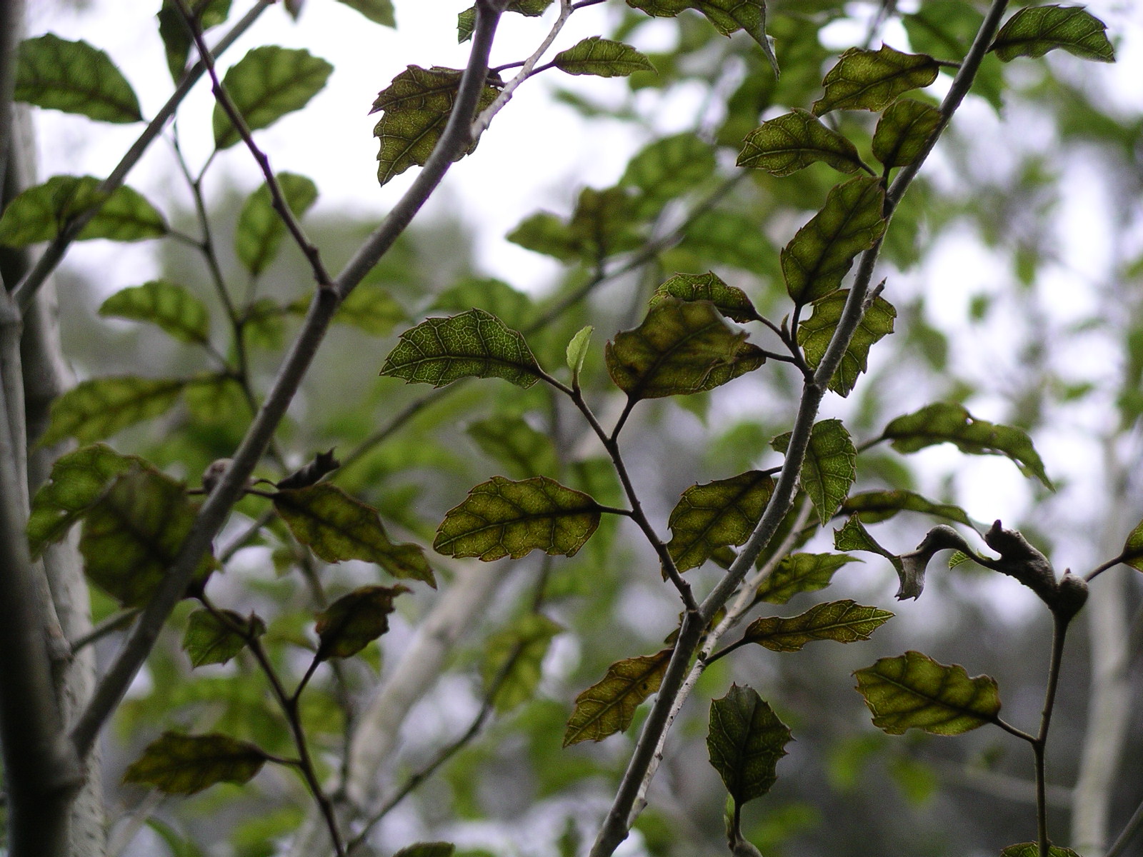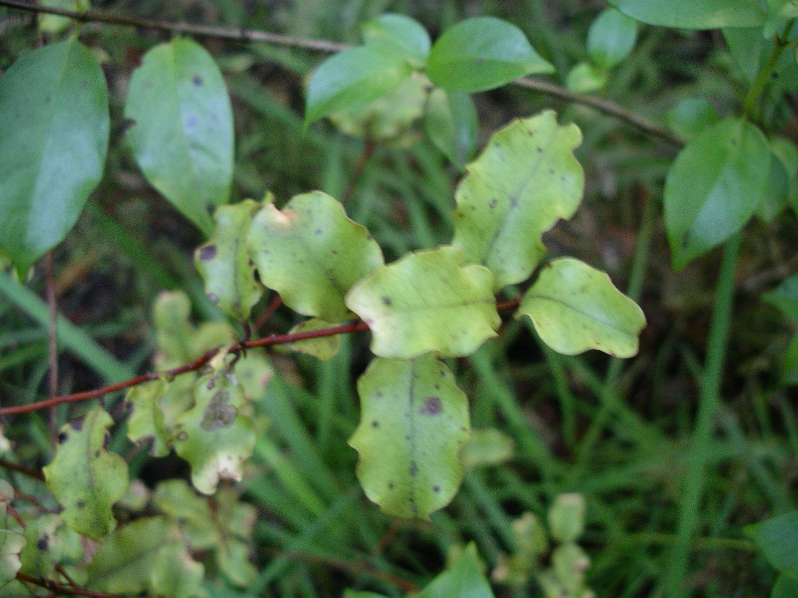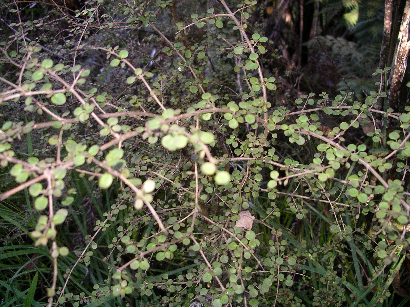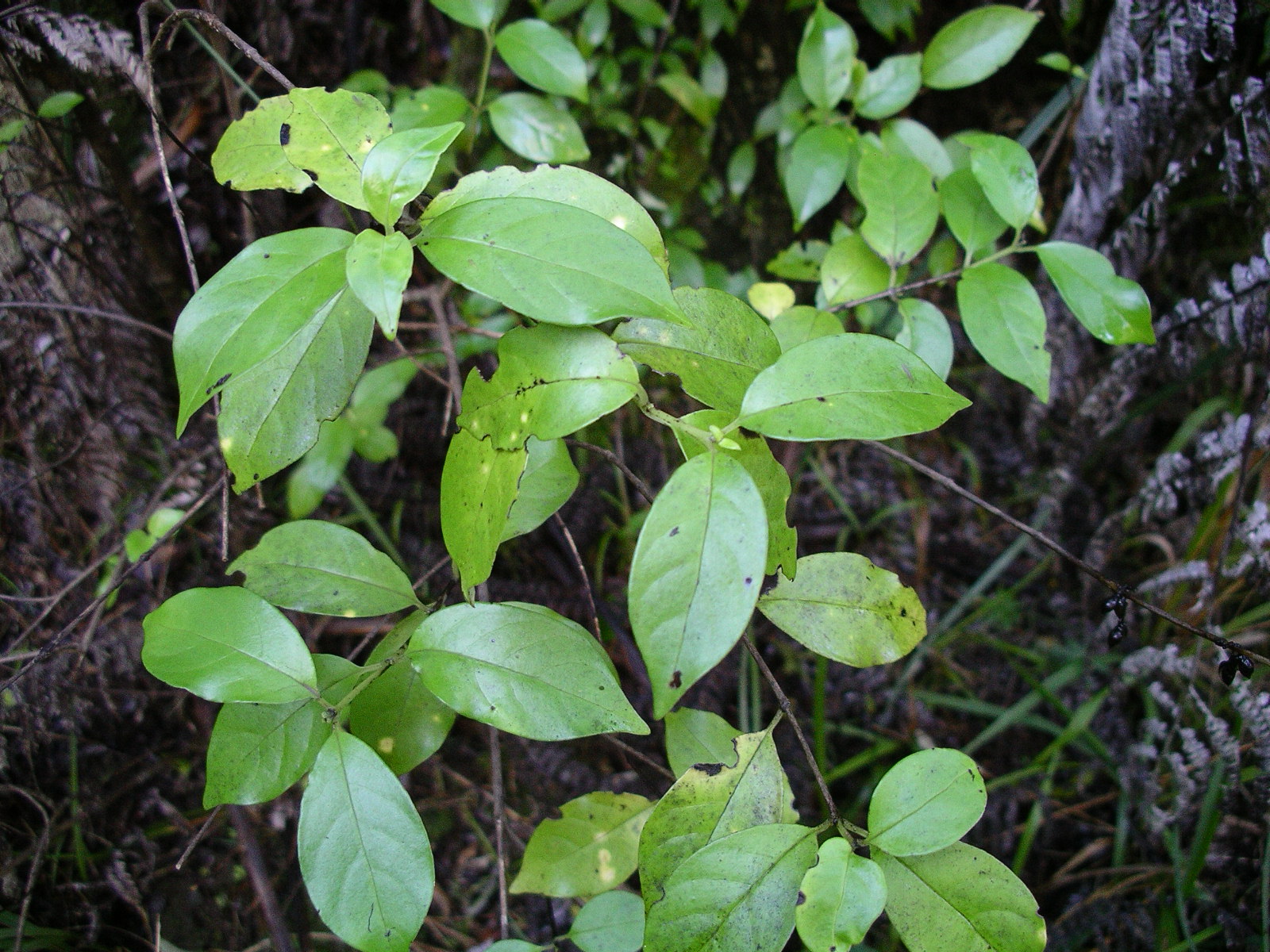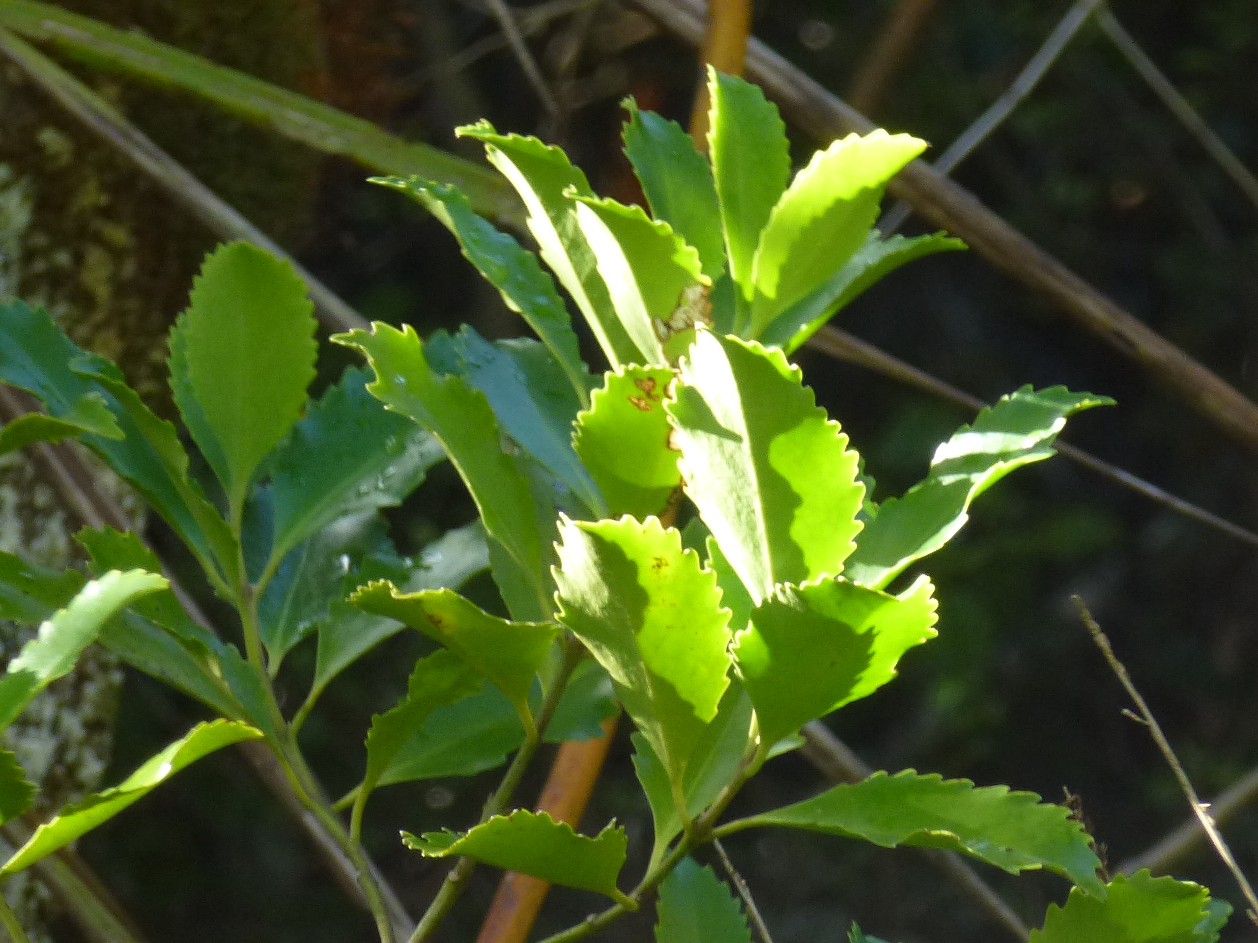 Māpou, or red matipo, (Myrsine australis) has reddish stems, carrying small wavy leaves which have red blotches. Here, hounds tongue fern (Zealandia pustulata) uses whiteywood trunks to reach the light.