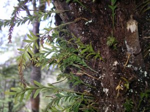 On the silver fern trunks, the tiny protruding fern is Tmesipteris elongata. All four Tmesipteris species are present in the park. For more detail see Just Scrub (mentioned below).