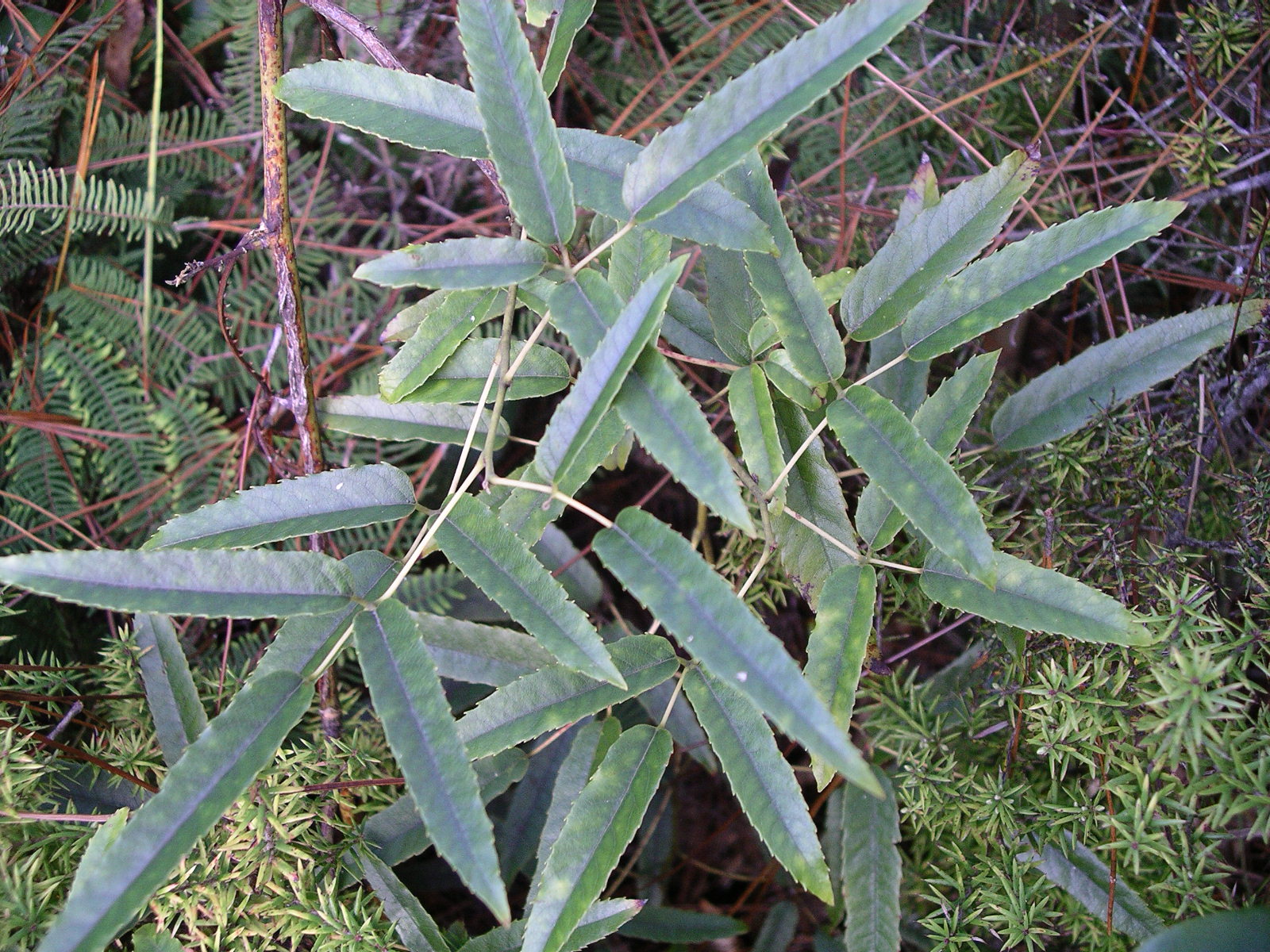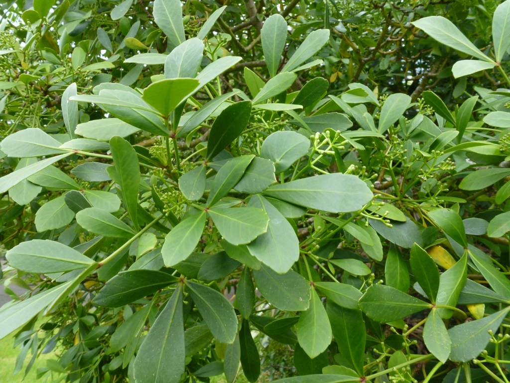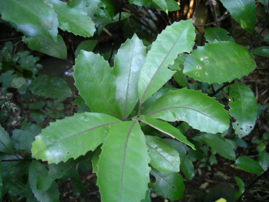 A specimen of coastal five finger, or houpara (Pseudopanax lessonii), a small, useful tree found in North Island coastal forest. The females fruit in June and July, providing a critical winter food source for birds.