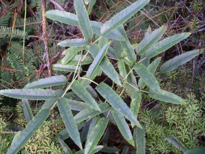 The small tree with erect, fine leaves is gumland grass tree (Dracophyllum sinclairii) – there are a number on this track but they are becoming increasingly rare as their gumland scrub habitat disappears. The wiry fern is clubmoss (Lycopodium deuterodensum). Here also is sword sedge (Lepidosperma laterale) – the only specimen of this interesting species in the park.
