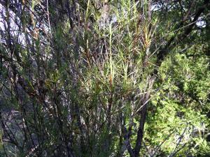 A thriving specimen of native broom (Carmichaelia australis). It has flattened stems and small mauve flowers in spring.
