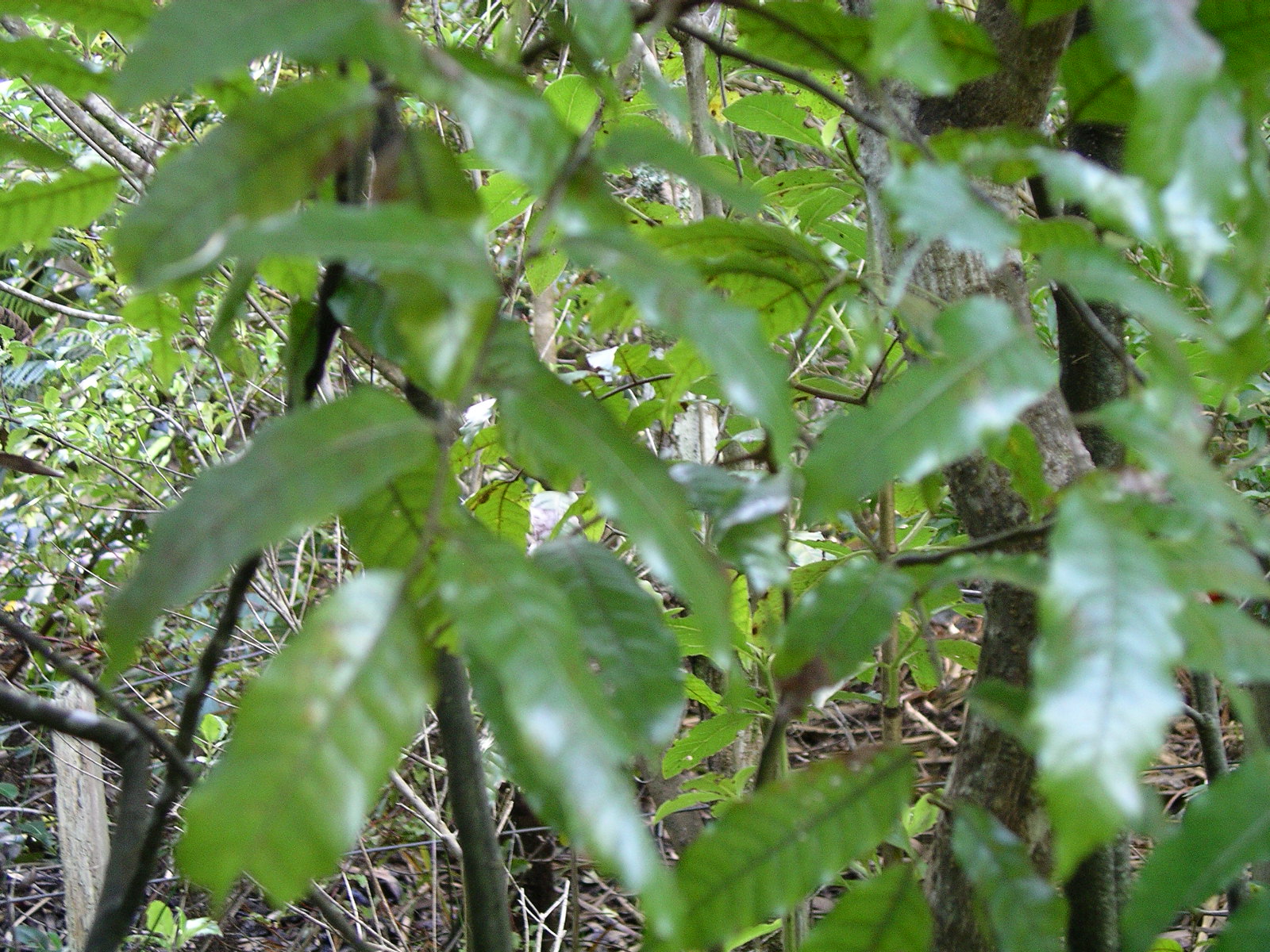 A grove of 50 or more tanekaha, or celery pine (Phyllocladus trichomanoides) — a familiar tree in the park and one of the most beautiful, especially in its juvenile stage. Note the horizontal ridges on their trunks. Tanekaha like growing on ridges.
