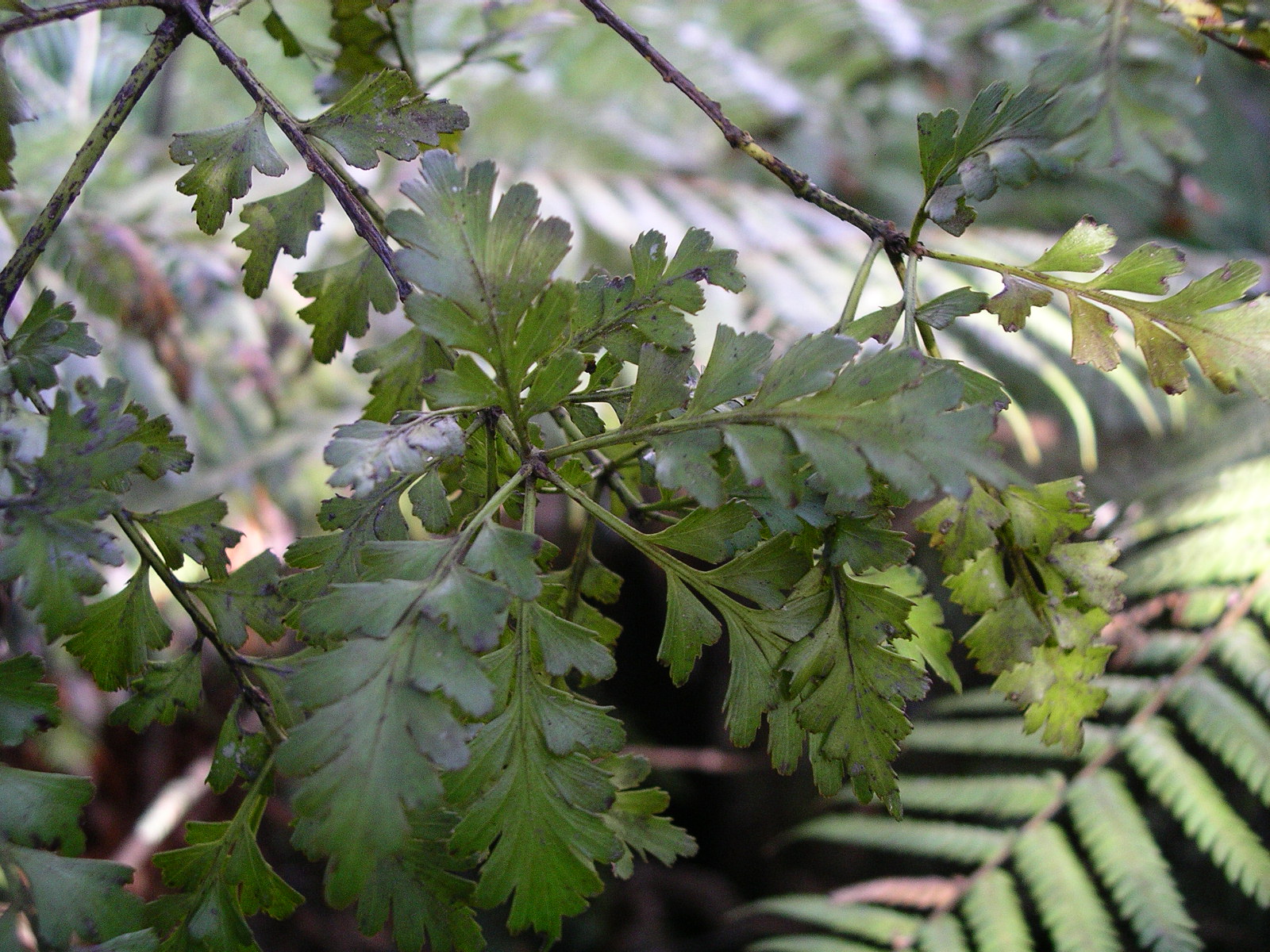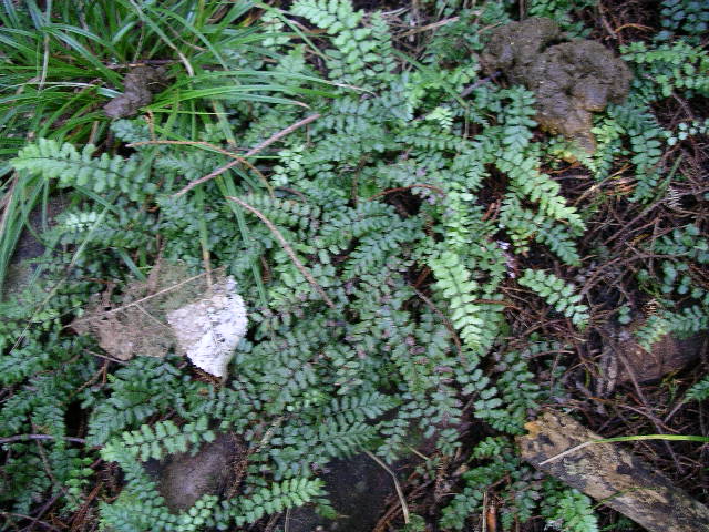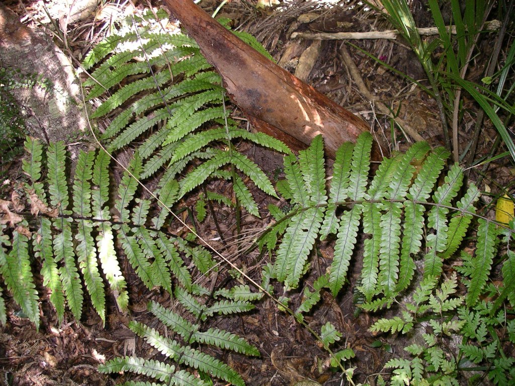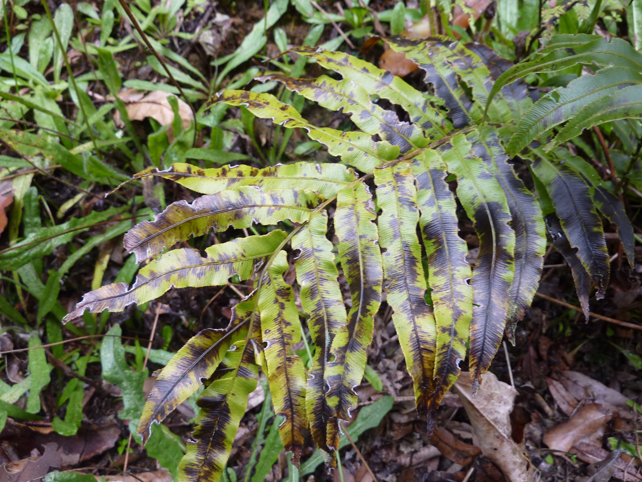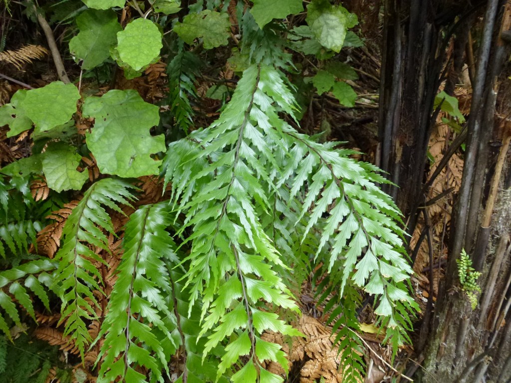 The shiny fern with serrated leaves is petako or sickle spleenwort (Asplenium polyodon). Nearby is shining karamu (Coprosma lucida).