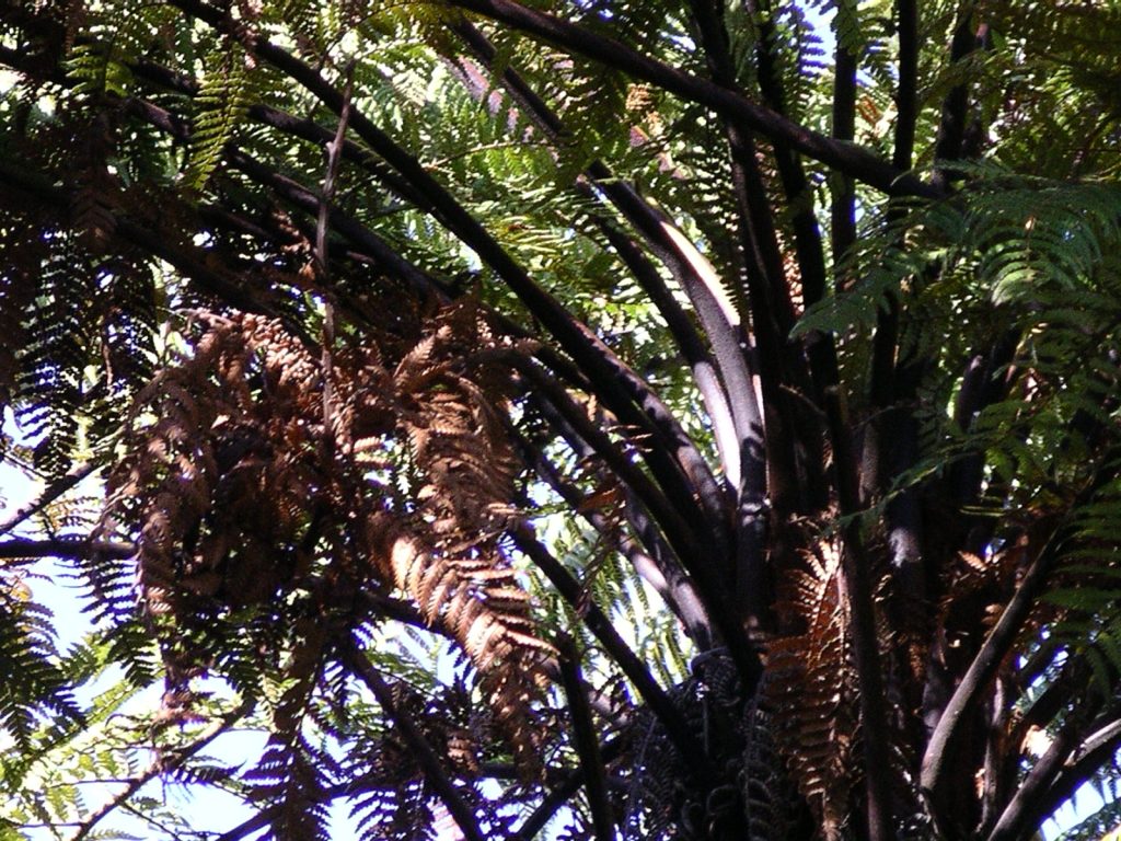 Two contrasting tree ferns here: silver fern and the rough tree fern, or whekī (Dicksonia squarrosa), which is hardy and fast-growing. It has a slender black trunk clothed in tan-coloured dead fronds.