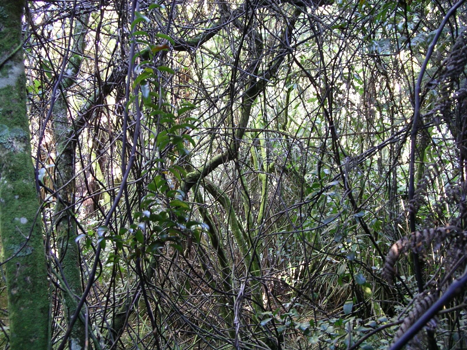 The tangle of snake-like vines is supplejack (Ripogonum scandens).