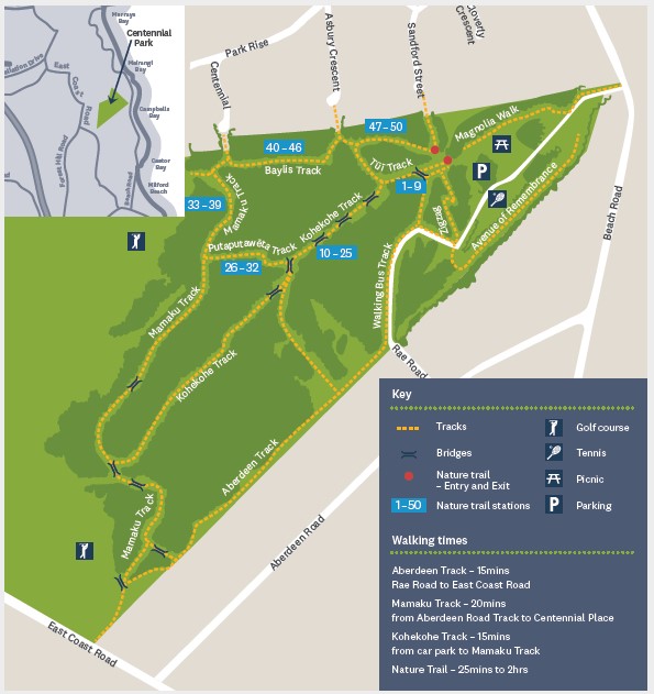 You are at the end of the trail and are back where you started. We hope you enjoyed it! More information about the park’s trees and plants can be found in Just Scrub – the Centennial Park Bush Society’s booklet, which is available from the society and is also published online: campbellsbayurbansanctuary.org.nz Just Scrub describes and illustrates the plants in the bush and is an excellent guide to recognising them and learning their common, Maori and botanical names.